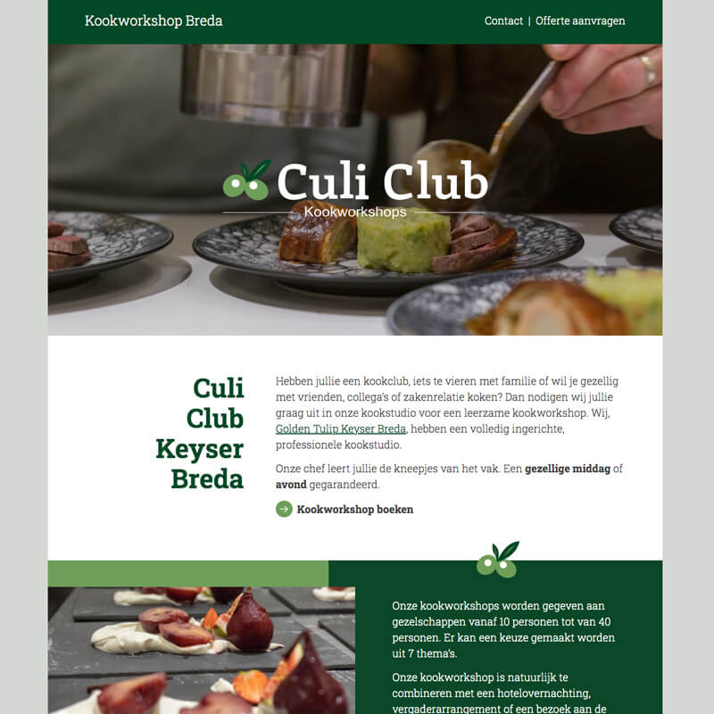Soms is vernieuwing echt nodig en dat was het geval bij de site van Culi Club Keyser Breda, https://www.kookworkshopbreda.nl/. Minder informatie, maar beter gepresenteerd. De wens was een simpele one-page website, waarin informatie op een overzichtelijke en aantrekkelijke manier staat gepresenteerd. Er zijn ook enkele kleine aanpassingen doorgevoerd in de huisstijl. Zodat deze beter aansluit bij de sfeer van de studio.